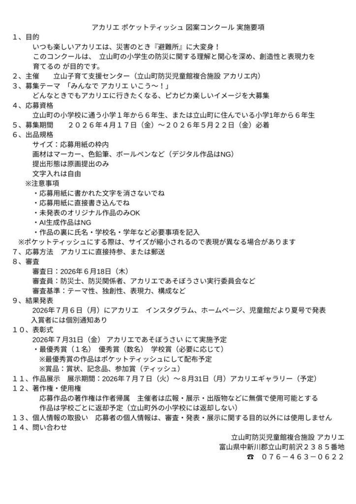 アカリエ ポケットティッシュ 図案コンクール実施要項をご確認ください。
