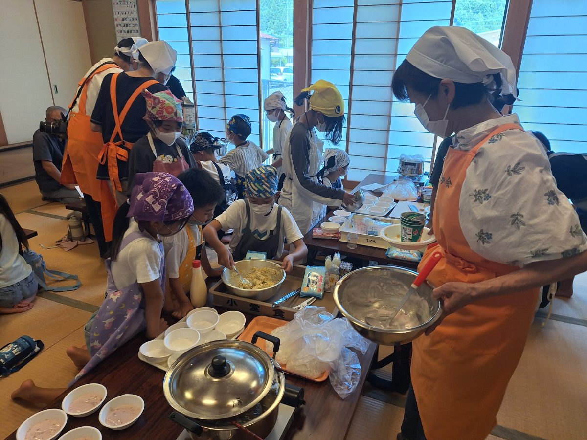 〇毎年、夏休みに毎週1回(全4・5回)「夏休み子ども教室」を開催しており、その中で昼食は食生活改善推進員の方々がボランティアでつくってくださっています。それを今回は子どもたちも一緒に作る料理体験しに、パッククッキングにチャレンジしました。メニューは事前に相談し、子どもたちが食べやすい「カレー」に決定。副菜として以前の防災イベントで好評だった「じゃがりこポテトサラダ」、デザートは簡単に作れる「フルーチェ」にしました。材料などの準備は全部、食生活改善推進員の方がしてくださり、老人会の方々が各班に入ってくださり、安全に料理体験が行える体制にしました。
