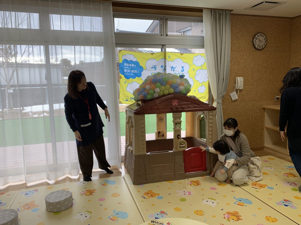 アカリエにあるこどもハウスの屋根から雪に見立てたボールを落とし、屋根雪の危険についておはなしをしました。